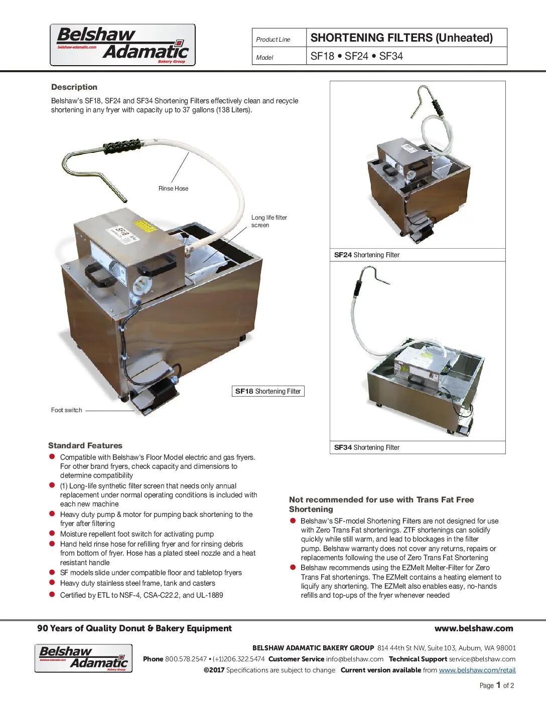 - SF Shortening Filters are not designed for Zero Trans Fat shortenings. These shortenings solidify as they cool down, sometimes causing blockages in the filter pump.