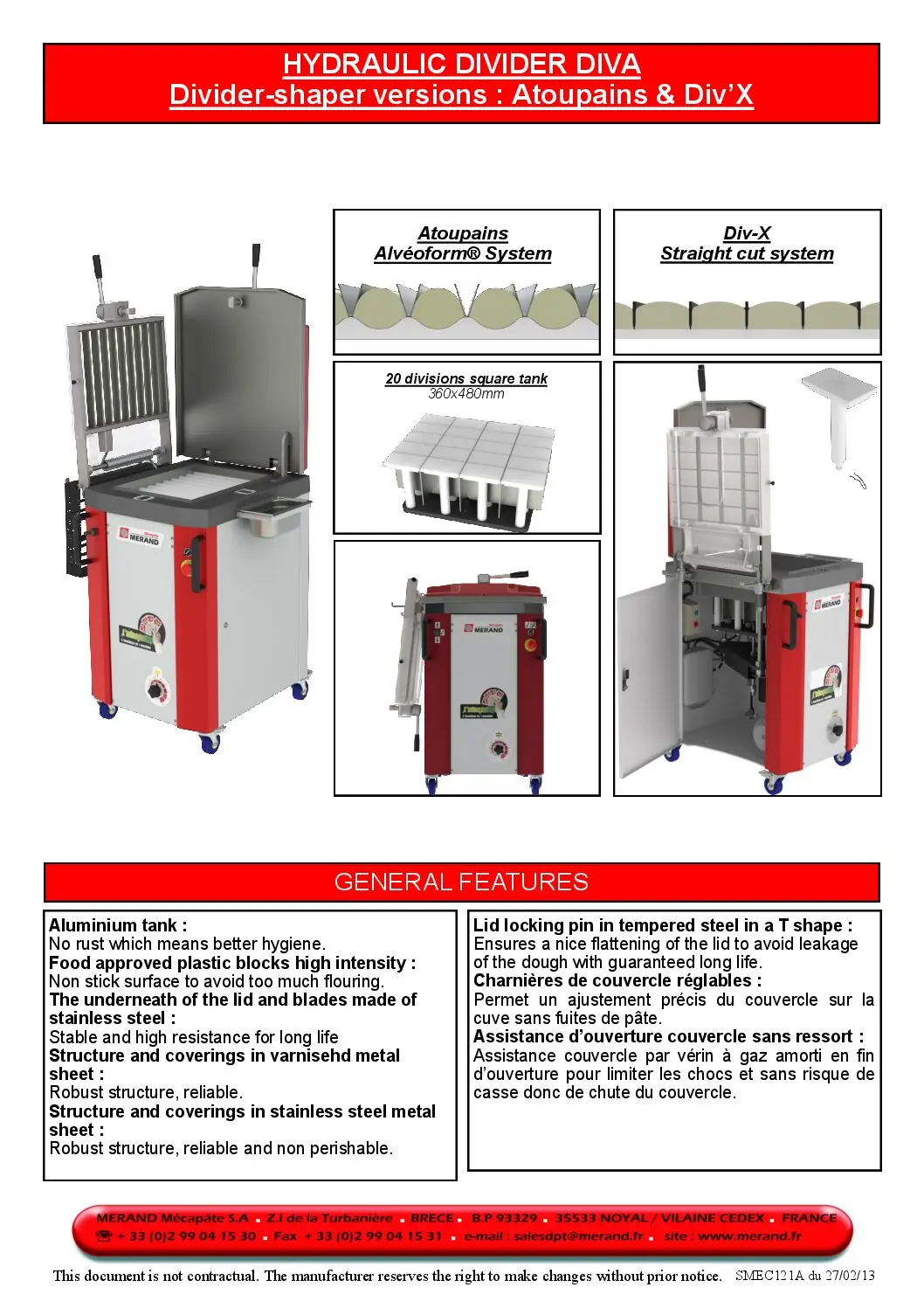 - Exclusive MERAND Systems can be added to fit extra requirements such as : APF®, Non Flour Splatter / FlourBox®, removable flourbox / Variopress®, pressure sensor according to dough type / EasyDoors®, safe and easy cleaning system without tools / FlexiTable®, foldable worktable.