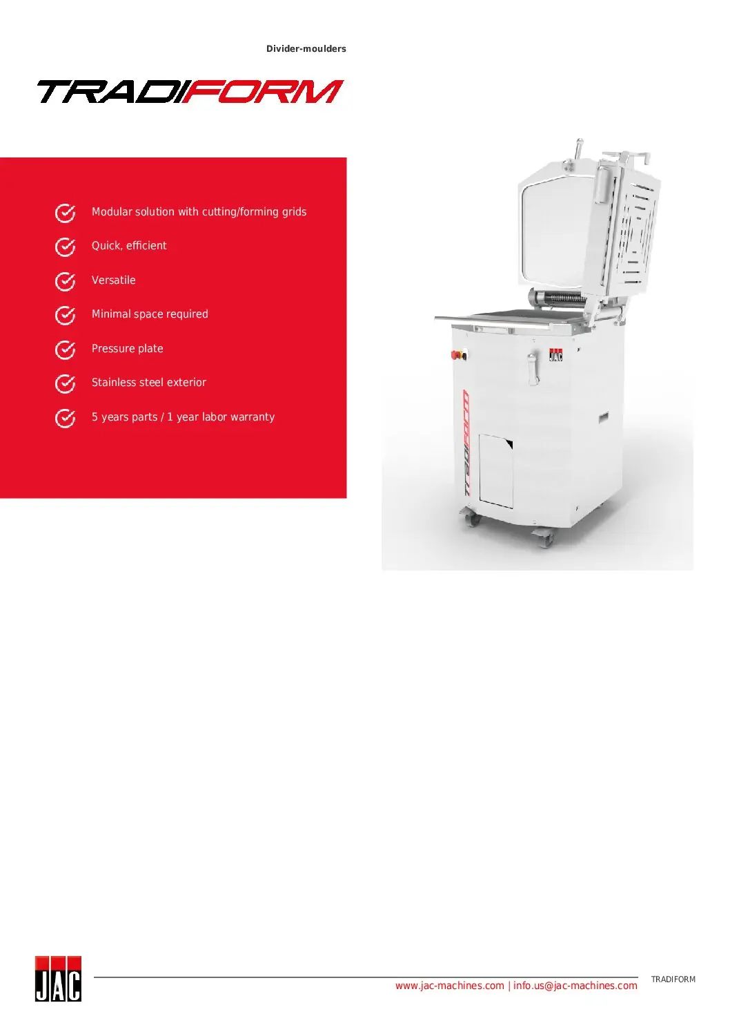 Tradiform is perfect combination of an in-tank divider and grid divider. Perfectly suited to all types of dough, it will enable you to divide up to 19 kg in tank or 5 kg via a grid. It is equipped with a pressure plate and a grid holder to benefit from the very wide range of over 100 grids, from which you are bound to find THE right mould for your product. JAC has made ambitious technical choices: reinforced piston, cast aluminium floats with EASY CLEAN treatment, Click&Cut, Start and Stop system, sharpened stainless-steel knives, square stainless-steel tank, flour recovery system, pressure setting facility. These advantages make it a benchmark machine on the bakery market. It can also be equipped optionally with the Easyflour flour dispenser and the automatic Fullmatic system.