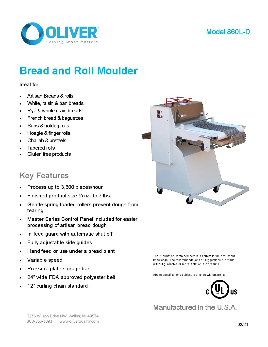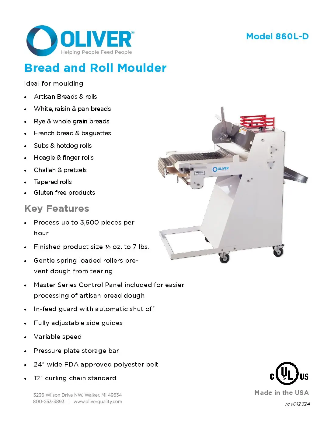 The Bloemhof Bread and Roll Moulder Model 860L is a simple, versatile bakery workhorse. Easily and with single person efficiency mould rolls and breads ranging from 1/2 ounce to 7 lbs.