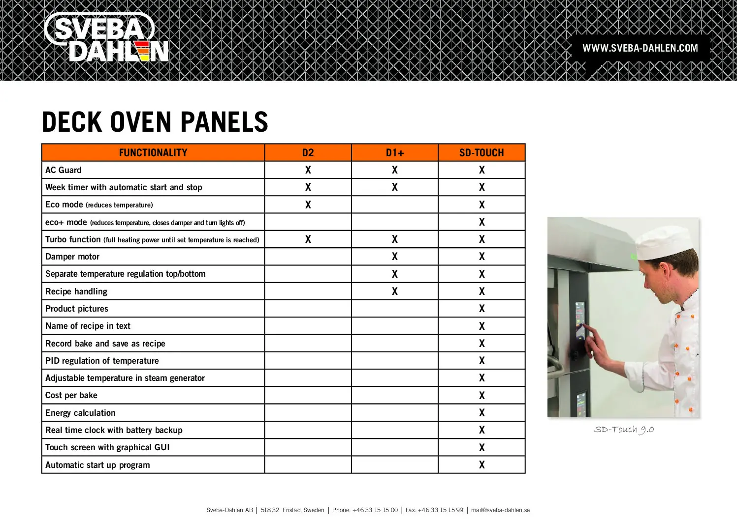 - Ease of Maintenance: With minimal moving parts, a robust handle, and high-temperature-resistant seals, the Sveba Dahlen D-Series deck oven is easy to clean and maintain.
